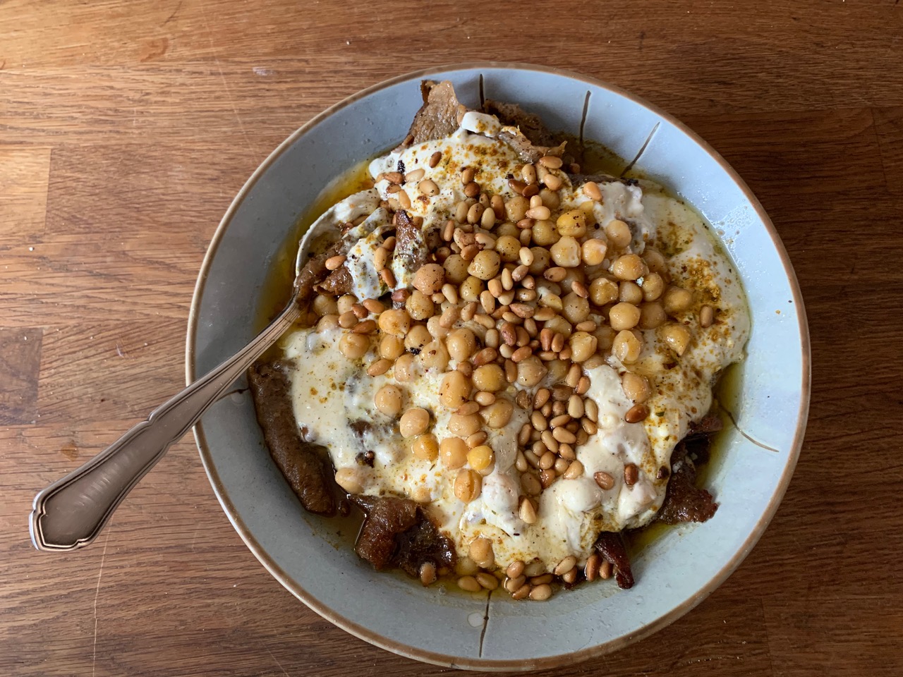 Fatteh is authentiek street food uit Damascus. Het bestaat uit stukjes vers, geroosterd, gegrild of gebakken platbrood bedekt met oa kikkerersten en een yoghurtsaus. De finishing touch is gloeiend hete gesmolten ghee (geklaarde boter).